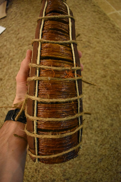 I created two wire-frame horns that I wrapped in duck tape and stuffed. I then wrapped these horns with hemp cord and dyed the hemp with leather dye while it was on the horn frame. As I wrapped, I used straight pins to create gaps across the front of the horns so that you would be able to see light through them. Next I painted a heavy layer of mod podge on to glue the hemp together and maintain some flexibility.